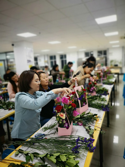 活動(dòng)現(xiàn)場(chǎng),花藝?yán)蠋熛虼蠹以敿?xì)講解了花藝知識(shí)及插花技巧,并進(jìn)行操作演示。 在花藝?yán)蠋煹闹笇?dǎo)下,大家開始認(rèn)真修剪枝葉、設(shè)計(jì)造型,發(fā)揮自己的想象及創(chuàng)造力,通過悉心修剪和巧妙的組合,一盆盆典雅的花束悄然綻放。