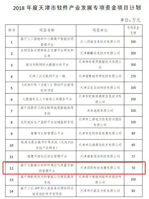 同陽科技被列入2018年天津市軟件產(chǎn)業(yè)發(fā)展專項計劃名單