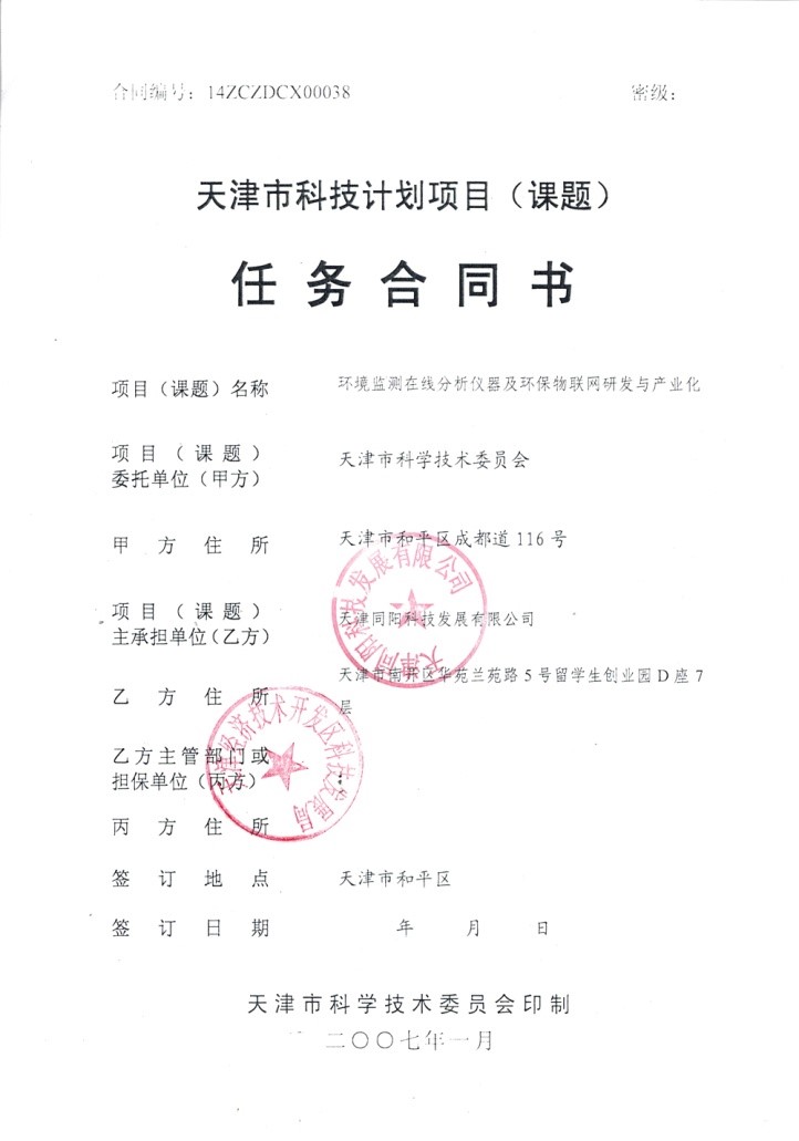 更新時(shí)間: 點(diǎn)擊:25552 所屬欄目:公司新聞 Update Time: Hits:25552 Belong Column:News2014年11月19日,由天津同陽(yáng)科技發(fā)展有限公司牽頭的“環(huán)境監(jiān)測(cè)在線分析儀器及環(huán)保物聯(lián)網(wǎng)研發(fā)與產(chǎn)業(yè)化”項(xiàng)目,經(jīng)天津市科學(xué)技術(shù)委員會(huì)批準(zhǔn)列入“2014年天津市科技支撐計(jì)劃重點(diǎn)項(xiàng)目”,在“資源環(huán)境”領(lǐng)域獲得立項(xiàng)支持。
