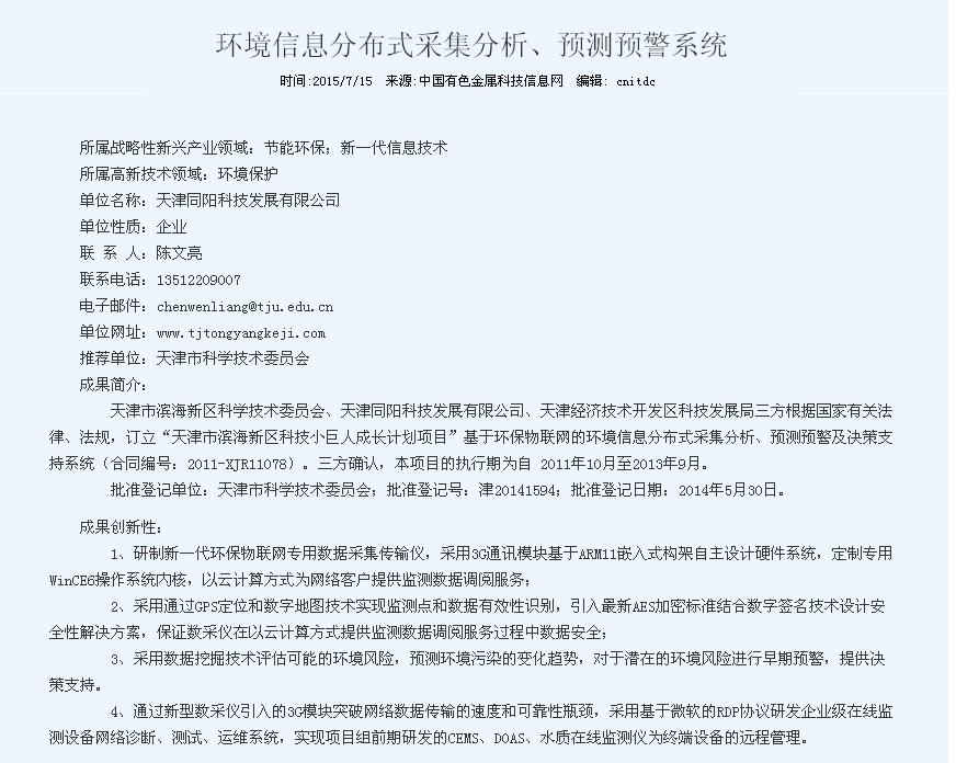 同陽科技獲得天津市濱海新區(qū)科學技術進步獎 更新時間:2015-07-15 點擊:23861 所屬欄目:公司新聞 Update Time:2015-07-15 Hits:23861 Belong Column:News 天津同陽科技申報的“環(huán)境信息分布式采集分析、預測預警系統”項目,獲得天津市濱海新區(qū)科學技術進步三等獎。