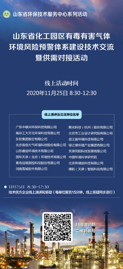 為貫徹落實《山東省〈關(guān)于構(gòu)建現(xiàn)代環(huán)境治理體系的指導(dǎo)意見〉的若干措施》有關(guān)要求,有效推進(jìn)山東省化工園區(qū)有毒有害氣體環(huán)境風(fēng)險預(yù)警體系建設(shè)工作,山東省生態(tài)環(huán)境廳委托省環(huán)保技術(shù)服務(wù)中心將于2020 年11 月25 日(星期三)上午8:30 -12:30通過線上直播平臺舉辦化工園區(qū)有毒有害氣體環(huán)境風(fēng)險預(yù)警體系建設(shè)技術(shù)交流暨供需對接活動。經(jīng)過資格審查、技術(shù)水平和技術(shù)能力綜合評估,同陽科技被推薦為線上演講及交流單位參加化工園區(qū)有毒有害氣體環(huán)境風(fēng)險預(yù)警體系建設(shè)技術(shù)交流暨供需對接活動,并于活動當(dāng)天做《化工園區(qū)有毒有害氣體環(huán)境風(fēng)險預(yù)警體系解決方案》主題技術(shù)演講,現(xiàn)誠邀您參會交流!